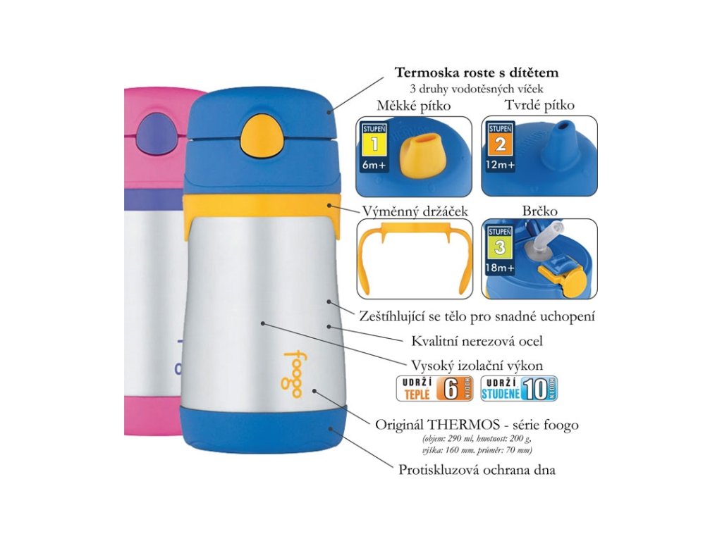 Termofľaša a jednotlivé pítka sú navrhnuté tak, aby sa deti dokázali samé napiť. Telo termosky je v hornejšej časti zúžené, aby deti samy mohli ľahko držať termosku. Termoska Foogo udržuje požadovanú teplotu nápojov po dlhú dobu - čaj udrží teplý až 6h. Je ľahká, ľahko sa zmestí do batohu, kočíka, či držiaka nápojov v automobile.