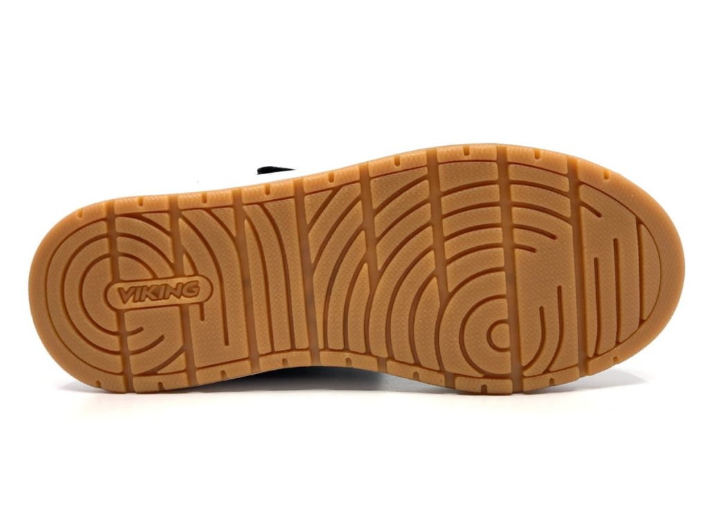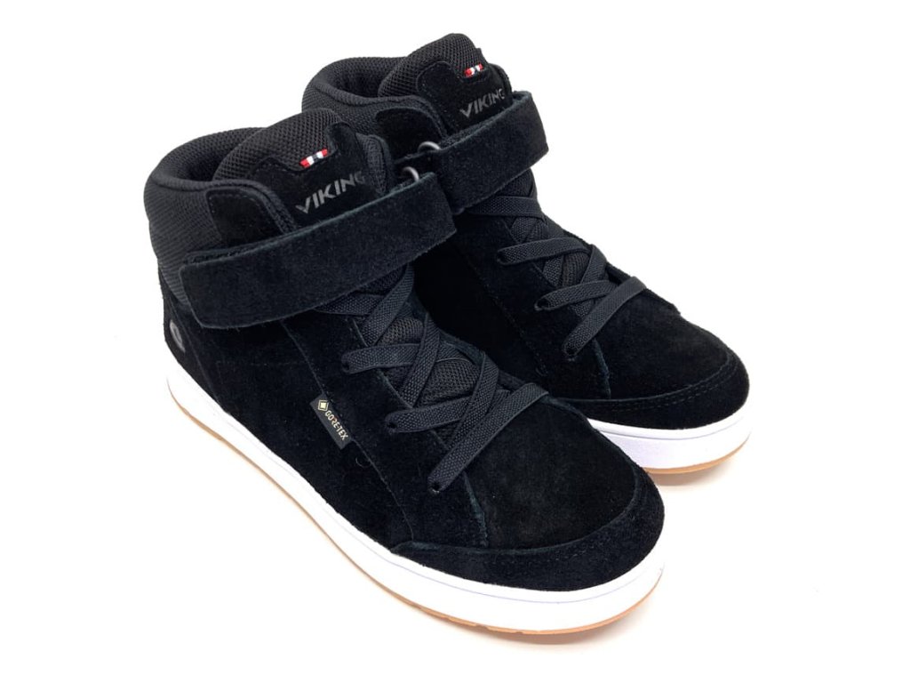Moderné členkové juniorské topánky Viking Eagle Light GTX Black v čiernej farbe s klasickou bielou podrážkou, ktorá je zo spodnej strany vo farbe prírodnej gumy. Na ombináciu brúsenej kože a textilných materiálov. Membrána zaistí nepremokavosť a zároveň priedušnosť, takže udrží detské nohy v suchu a pohodlí. Reflexný prvok za pätou pre väčšiu bezpečnosť.