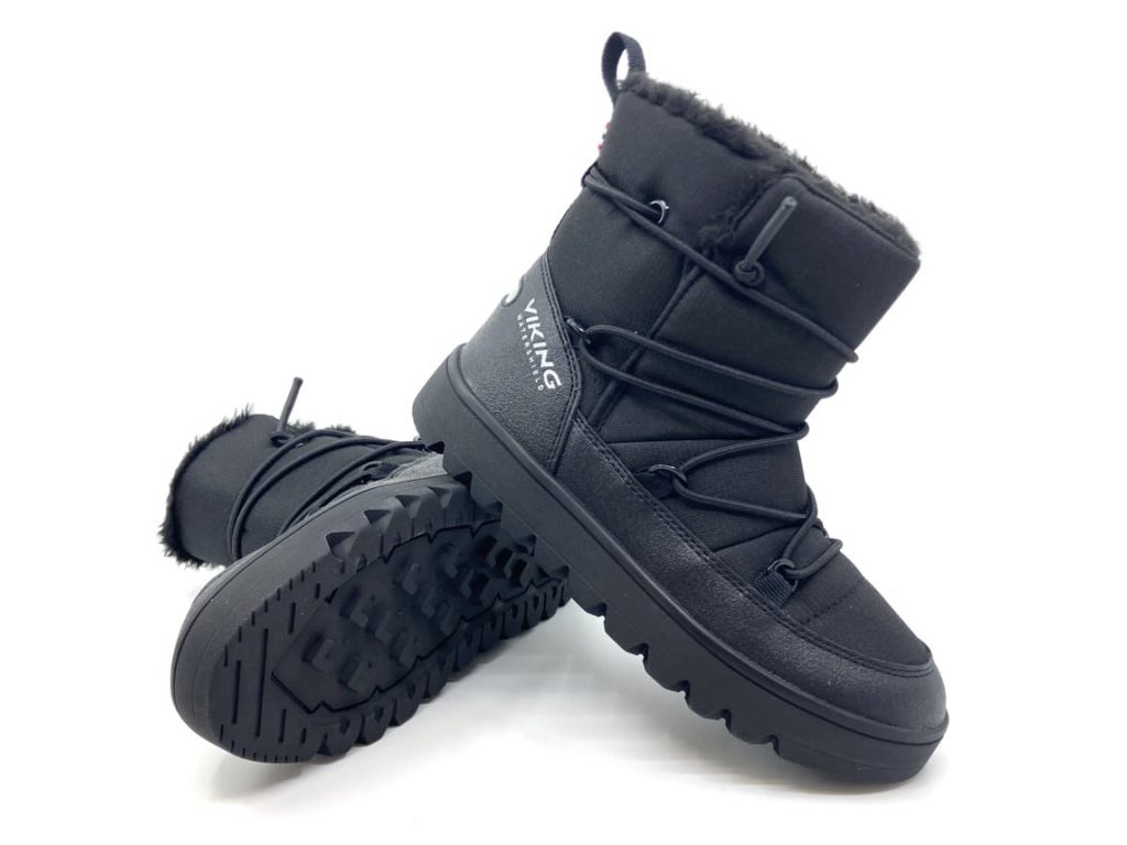Moderné juniorské zimné topánky Viking Snowflake Warm WP SL Black v čiernej farbe, s reflexným prvkom na päte. Kombinácia odolných syntetických materiálov a textilu . Topánky sú výrazne zateplené teplým kožúškom, vrátane stielky. Membrána zaistí nepremokavosť a zároveň priedušnosť, takže udrží detské nohy v suchu a pohodlí. Topánky sú skôr pevnejšie, podrážka je veľmi odolná.