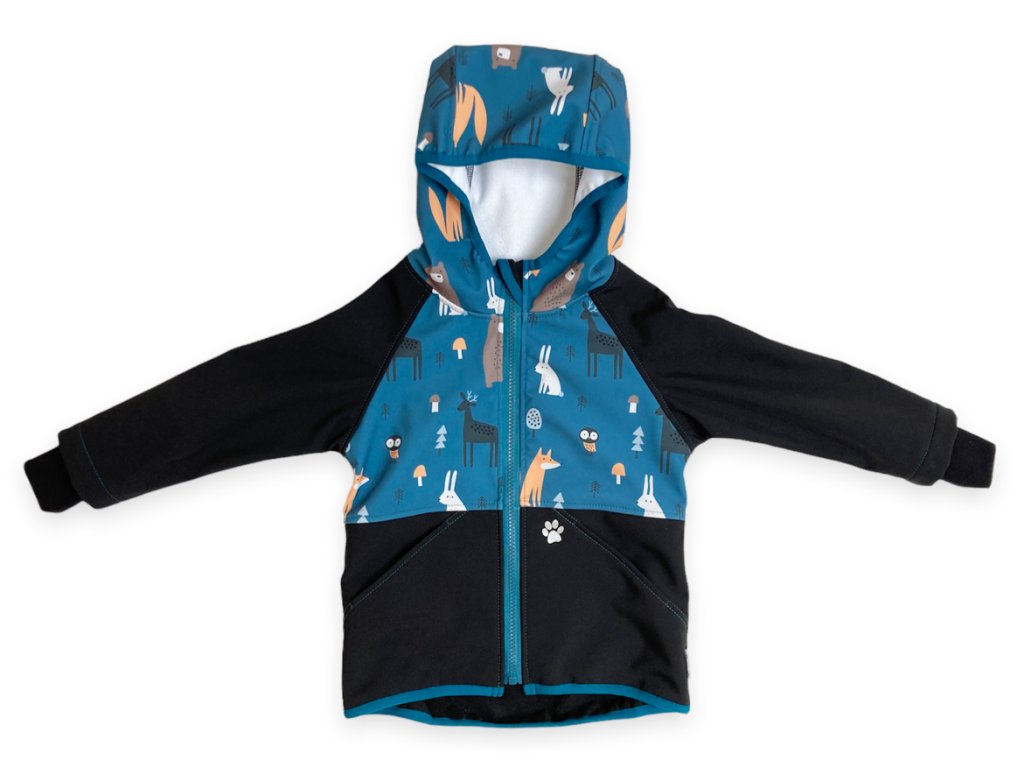 Túto bundičku zo zimného softshellu si chlapci rýchlo obľúbia nielen pre veselý motív zvieratiek z lesa, ale určite budú na nej milovať veľké vrecká, do ktorých sa zmestia všetky poklady z prechádzok :-) Vďaka predĺženému zadnému dielu a nápletom v rukávoch z bundy navyše len tak rýchlo nevyrastú.