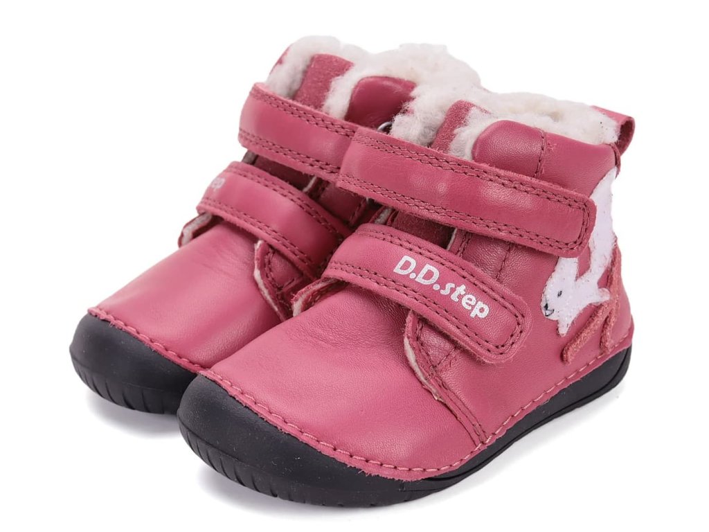 Zimné topánky DD step W070-52214B Dark Pink z hladkej kože v ružovej farbe s motívom veveričky. Sú bez membrány, takže nie sú nepremokavé.