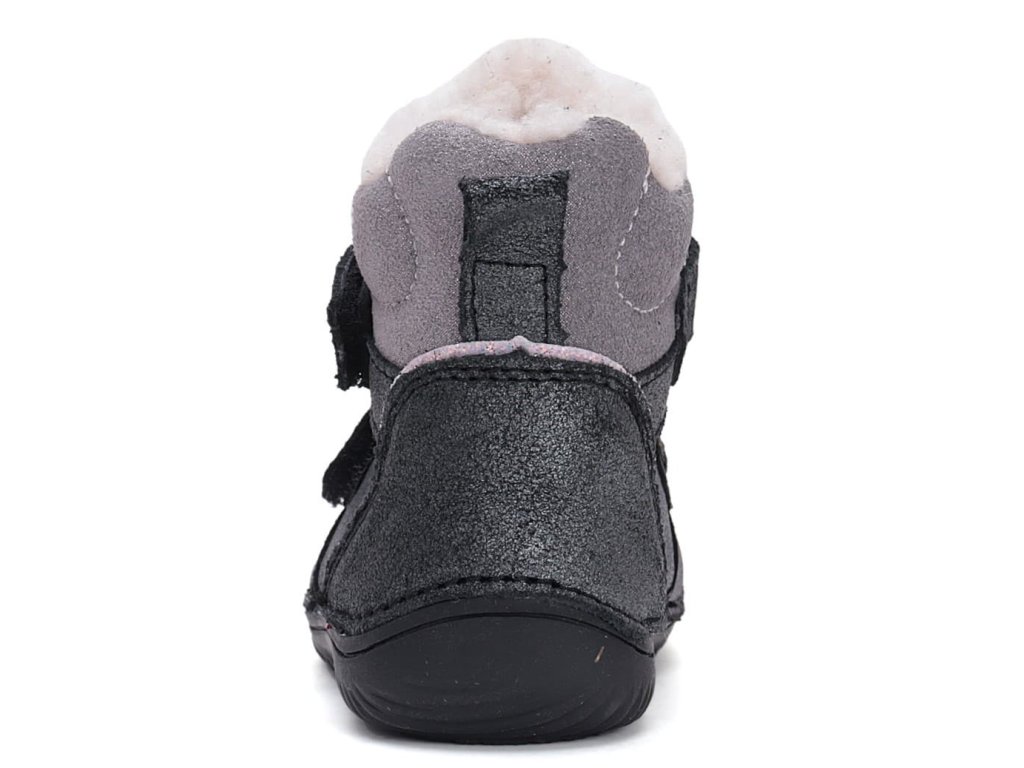 Barefoot zimné topánky DD Step W073-42814A Black v lesklejšej šedo-čiernej farbe s ružovými prvkami a so strieborným jazykom sú naozaj štýlové. Topánky sú celokožené, končia nad nad členkom. Vnútri celej topánky je teplý kožúšok . Sú ideálne do mestskej zimy na ihrisko aj do škôlky. Pre všetky malé slečny k džínsom aj k sukni.
