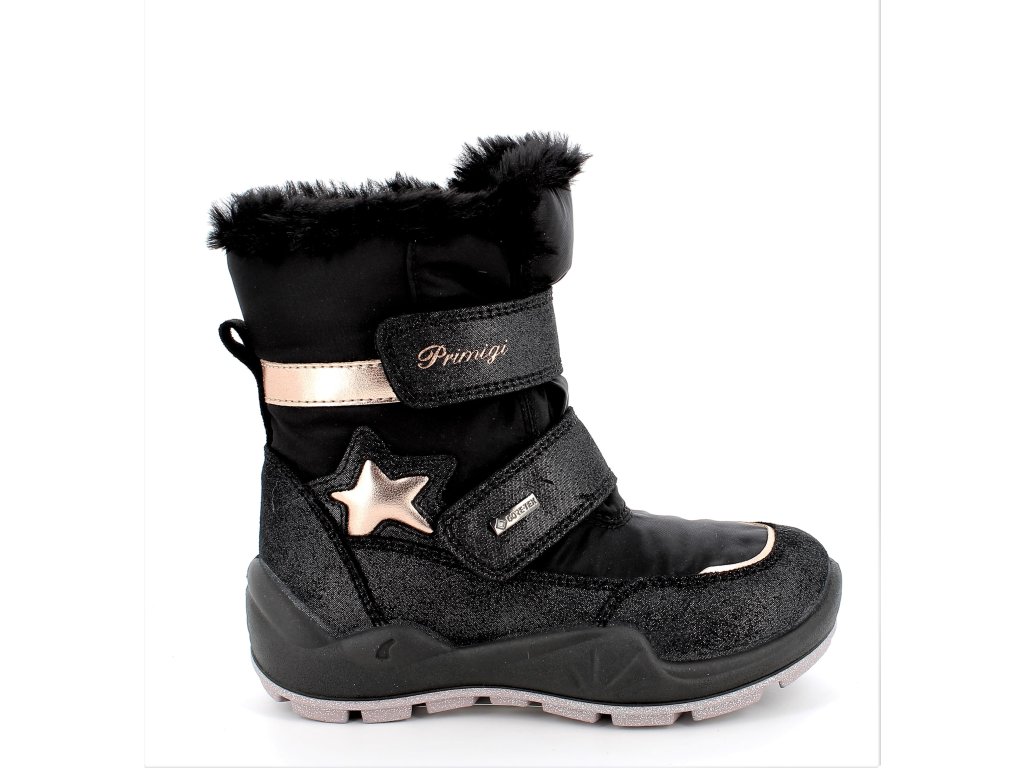 Dievčenské zimné topánky Primigi 8881555 Gore-Tex v čiernej farbe s membránou Goretex. Elegantná čierna brúsená koža s trblietkami a jemné bronzové doplnky. Po celom vnútrajšku je teplý kožúšok, len v hornej časti je pre efekt z jemného plyšu, ktorý je aj veľmi priezvisko na omak. Topánky sú vyššie, a tak zahrejú nohy približne až do polovice lýtok. Sú vybavené GoreTex membránou, ktorá vo vnútri zaistí sucho za každej situácie.