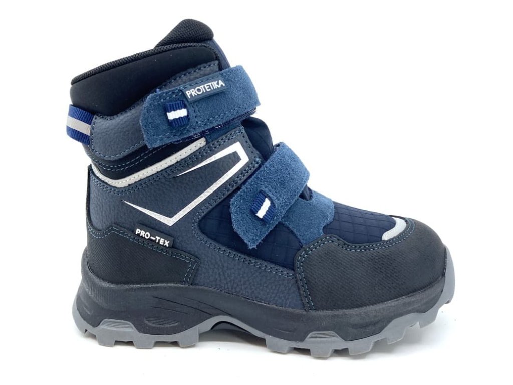 Chlapčenské zimné topánky Protetika Esmo Navy s membránou v tmavo modrej farbe. Tieto teplé zimné topánky kombinujú moderný design s pokročilými technológiami pre maximálne pohodlie a ochranu. Vďaka membráne sú topánky vodeodolné a pritom priedušné .