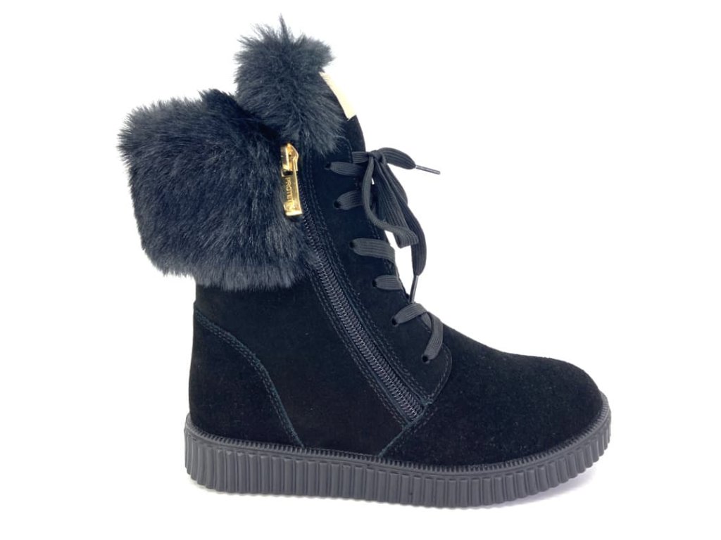 Módne a štýlové zimné topánky Protetika Kaja Black sú vysoké, siahajú až po lýtko. Zateplené jemným umelým kožúškom s vysokým chlpom, stielka je s nášľapom zo semišu (textil). Šnurovanie je doplnené dvoma postrannými funkčnými zipsami - topánku je možné úplne otvoriť a pohodlne obuť. Vďaka šnurovaniu sa topánka výborne prispôsobí v oblasti členku a lýtka.